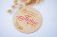 Announce your newborn to the world with this beautifully made baby name plaque. The round baby name plaque is available in either acrylic or wooden material layered with beautifully cut acrylic name.
